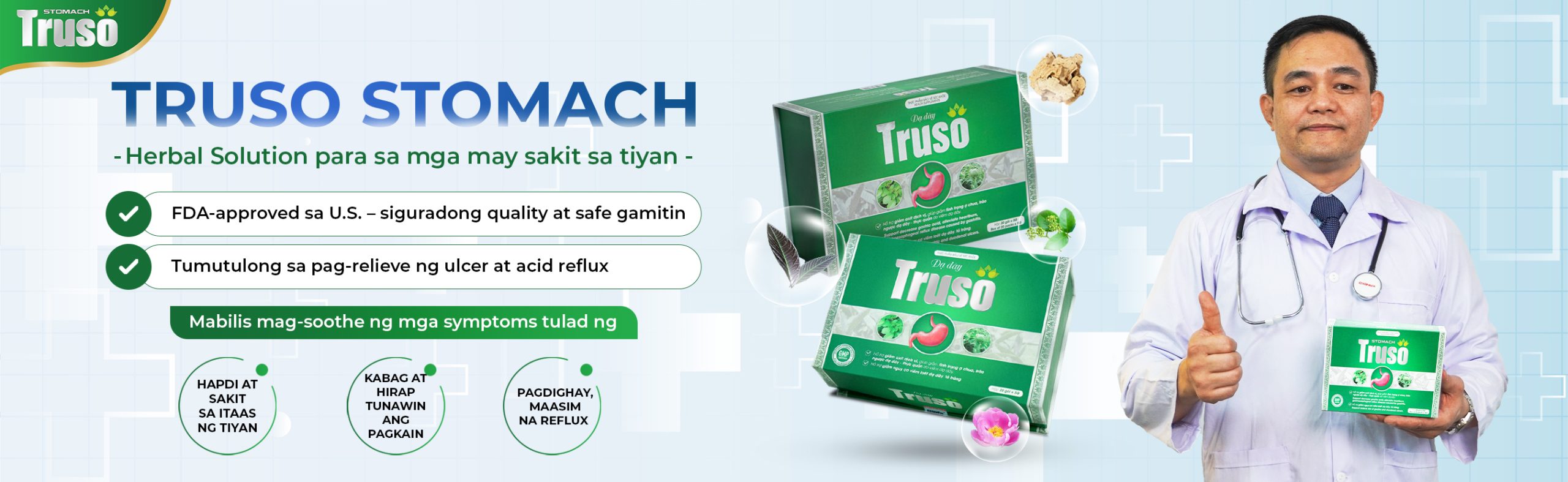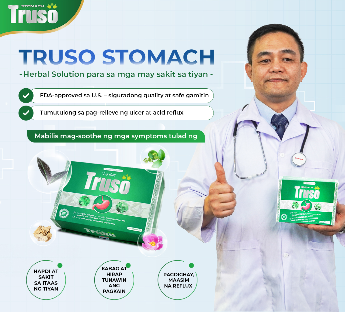 Ang Truso Stomach ay isang makabagong solusyon sa agham na may 4 na komprehensibong mekanismo para sa mga taong may gastric ulcers at gastroesophageal reflux disease (GERD), na tumutulong upang: i-neutralize at bawasan ang gastric acid, pigilan ang acid reflux, hadlangan ang HP bacteria, protektahan ang lining ng tiyan, at pagbutihin ang mga ulcers. Napatunayan na ang produkto sa mga sumusunod na benepisyo: Neneutralize at binabawasan ang gastric acid, pinipigilan ang acid reflux, at pinapabuti ang gastric ulcers. Hinahadlangan ang HP bacteria – ang pangunahing sanhi ng gastric ulcers. Binalot at pinoprotektahan ang lining ng tiyan, binabawasan ang sakit sa tiyan at pinipigilan ang erosion na dulot ng gastric acid, nagbibigay ng oras upang gumaling ang lining cells. Pinapabilis ang pagtunaw, pinapabilis ang pag-alis ng laman ng tiyan, binabawasan ang acid reflux, kabag, heartburn, at maasim na pagdighay.